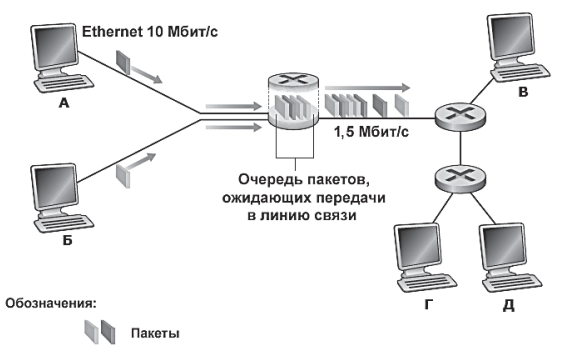 Хосты сначала отсылают их по Ethernet-каналу (10 Мбит/с) на первый маршрутизатор. Маршрутизатор перенаправляет эти пакеты в канал со скоростью передачи 1,5 Мбит/с. Если в короткий промежуток времени скорость прибытия пакетов на маршрутизатор (в бит/с) превышает 1,5 Мбит/с, на нем происходит перегрузка, и пакеты встают в очередь перед тем, как их отправят в выходную линию связи. Например, если хосты А и Б каждый отправят серию из пяти пакетов в одно и то же время, то большинство из этих пакетов будут некоторое время ждать очереди. Ситуация на самом деле полностью аналогична многим каждодневным ситуациям из жизни, например, когда мы стоим в очереди перед банкоматом либо в кассе магазина.