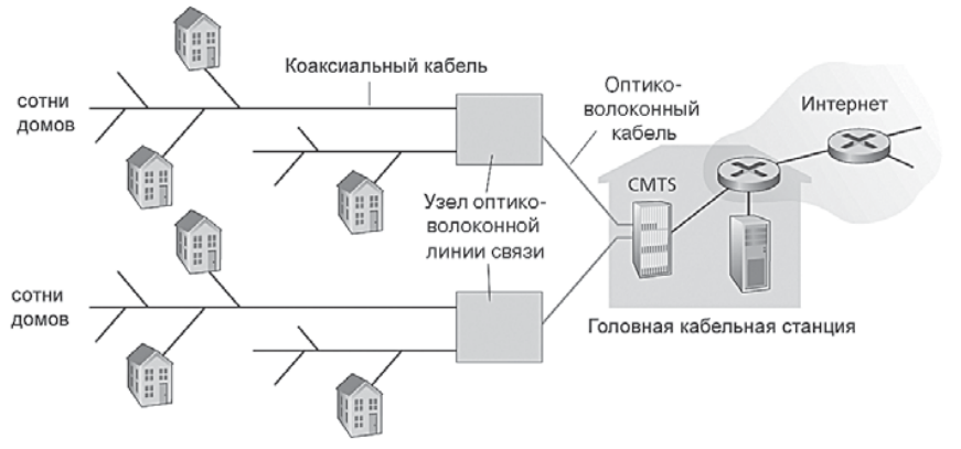 В то время как технологией DSL используется существующая местная инфраструктура телефонной компании, кабельный доступ в Интернет организуется с помощью существующей кабельной телевизионной инфраструктуры, предоставленной компанией кабельного телевидения. Именно от нее пользователь получает кабельный доступ в Интернет. Как показано на рис. ниже, головная кабельная станция посредством оптоволоконного кабеля подключается к разветвлениям уровня района или квартала, от которых дальше идет обычный коаксиальный кабель, используемый для подключения отдельных домов и квартир. Каждым районным разветвлением обычно поддерживается от 500 до 5000 домов. Так как в этой системе используются и волоконно-оптические, и коаксиальные кабели, ее часто называют гибридной оптико-коаксиальной (hybrid fiber-coaxial, HFC) кабельной сетью.
