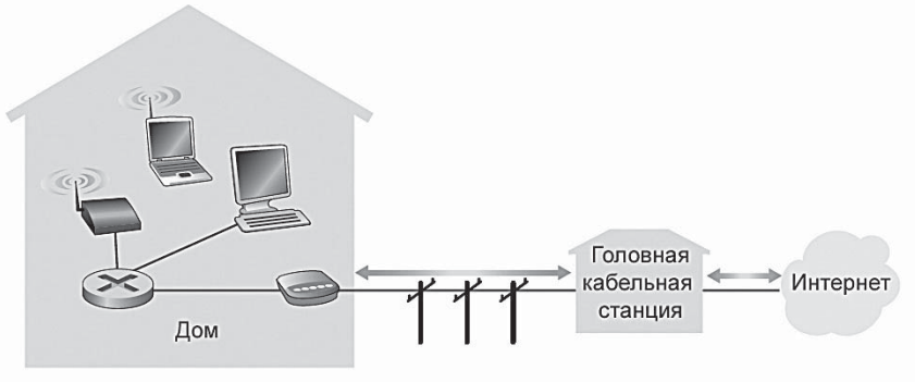Важная особенность кабельного доступа в Интернет состоит в том, что он является совместно используемым средством вещания. В частности, каждый пакет, передаваемый головной станцией, путешествует в нисходящем направлении по каждому каналу во все дома, а каждый пакет, передаваемый домом, путешествует по восходящему каналу в головную станцию. По этой причине, если несколько пользователей одновременно загружают видеофайл по нисходящему каналу, фактическая скорость передачи данных, с которой каждый пользователь принимает свой видеофайл, значительно меньше, чем суммарная скорость передачи нисходящих данных по кабелю. С другой стороны, если имеется лишь несколько активных пользователей и все они путешествуют по Интернету, то каждый может фактически загружать веб-страницы при максимальной скорости передачи нисходящих данных по кабелю, так как веб-страницы редко запрашиваются точно в одно время. Поскольку канал восходящих данных также используется совместно, необходим протокол распределенного множественного доступа, чтобы координировать передачи данных и избегать конфликтов.