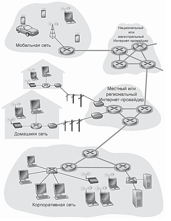 Конечные системы (хосты) получают доступ к Интернету через поставщиков услуг интернета (интернет-провайдеров) (Internet Service Providers, ISP). Каждый интернет-провайдер сам по себе имеет сеть, состоящую из коммутаторов пакетов и линий связи.