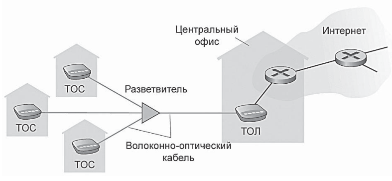 В каждом доме имеется терминатор оптической сети (ТОС), который соединяется по выделенному волоконно-оптическому кабелю с районным разветвителем. Данное устройство соединяет ряд домов (обычно менее 100) с одним совместно используемым оптическим кабелем, который, в свою очередь, подключен к терминатору оптической линии (ТОЛ) в центральном офисе телекоммуникационной компании. ТОЛ, обеспечивающий преобразование между оптическими и электрическими сигналами, соединяется с Интернетом через маршрутизатор телекоммуникационной компании. В доме пользователи подключают к ТОС домашний маршрутизатор (обычно беспроводной) и получают доступ к Интернету через него. В архитектуре PON все пакеты, передаваемые из ТОЛ в разветвитель, дублируются в разветвителе (аналогично головной кабельной станции).